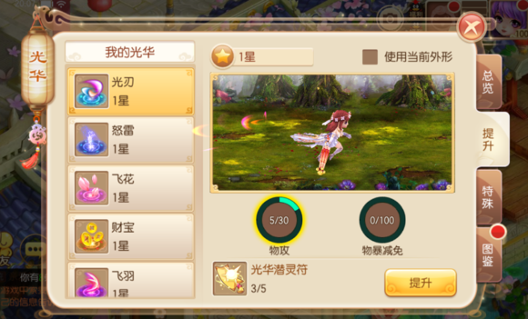 少侠可以通过各种途径收集光华道具。光华的升星可通过吞噬同一类型的光华进行升星,并且光华的属性可通过潜能符去进行提高。