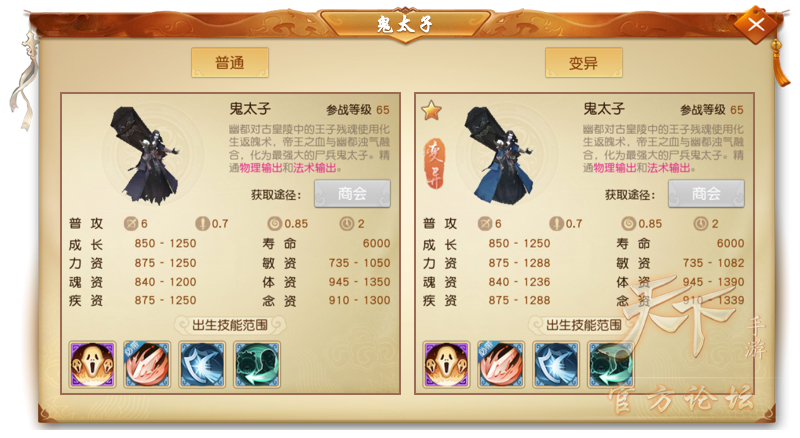 导读:天下手游召唤兽图鉴之鬼太子,鬼太子怎么样?鬼太子好用吗?小编为你详细讲解鬼太子技能! 召唤兽自带技能: 高级诅咒攻击:召唤兽普攻时,20%概率触发虚弱效果(状态命中力增加40),持续3秒,状态命中力随召唤兽等级的提升而提升。 饮血斩:召唤兽的普攻造成伤害时,会把伤害量的10%转换为自己的生命回复。 伤害反弹:召唤兽受到伤害时,30%概率反弹20%的伤害给攻击者。 状态转移:召唤兽出战后,20%概率承受主人的负面状态。 实际数据请以游戏内为准 [编辑:幼儿园扛把子]