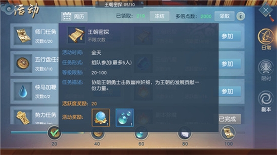 “王朝密探”——让诸多玩家快速升级、冲刺上榜的不限次数任务,不知道多少幽州奸细死于其中。下面直接进入“王朝密探”主题。 【活动简介】 玩家可以从下面的活动介绍可以看出,王朝密探是一个不限次数、不限时间段的活动任务,玩家只需要达到20级即可组队进行参与。协助王朝勇士来击败幽州奸细,为王朝的发展贡献一份力量。