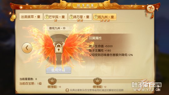 【正太萝莉齐上阵 奶爸奶妈变更强】宝宝的成长时期分为婴儿期、幼儿期与童年期。当孩子进入童年期以后,就可以和父母一起参与到战斗当中,并且为父母提供属性加成。当放入的武器、长生锁、童装、童鞋部位的玩具达到指定星数,并且百宝匣达到指定等级时,孩子将开启振翼通溟系统!