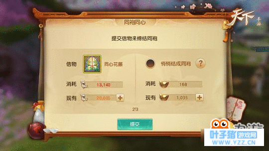 缔结同袍的双方达到50级,满1000友好度,提交信物“同心花藤”,写下你们的同袍誓言,就可以和你的同性好友结为兄弟啦!少侠还可以为自己的兄弟购买价值520元宝的[同袍宝],对方可获得等值军资,并在接下来60天不断获得额外返利哦!
