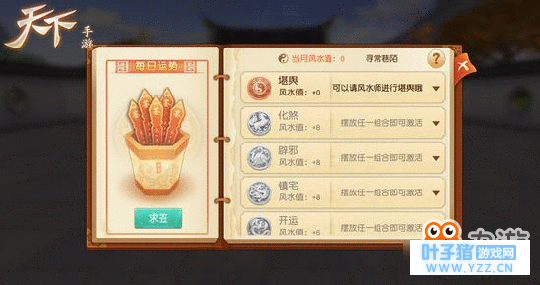 选一块风水宝地建豪宅,是不少人毕生的梦想!《天下》手游神木家园全新风水玩法,助你逆天改命。每一处家园都拥有自己的风水运程,少侠可以通过家园布局、测风水、算月运、每日抽签打卦等多样方式,把自己家园构建成“藏福纳财”的神邸。家园风水值越高,所得到的收益就越大,一不留神就可能有NPC携好礼拜访哦!
