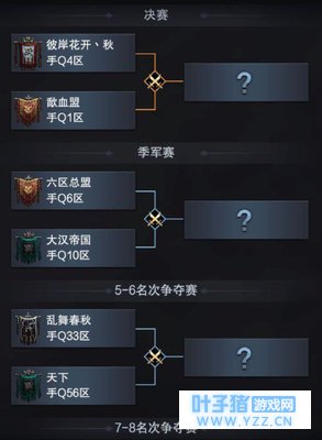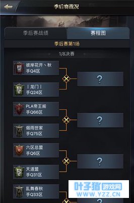 本次季后赛将会分为手Q区与微信区两大赛区,共计32个联盟参与。在经过了残酷又激烈的重重争夺后,手Q区进入总决赛的两支联盟分别是手Q4区的彼岸花开丶秋与手Q1区的歃血盟,微信区进入微信8区的两支联盟则是倾天下与微信100区风雨同舟。两个赛区均在4月14日晚上21:00的总决赛决出最强!其他主公亦可通过观战及竞猜,参与到精英联盟间的激烈角逐中去,体验前所未有的战斗体验!