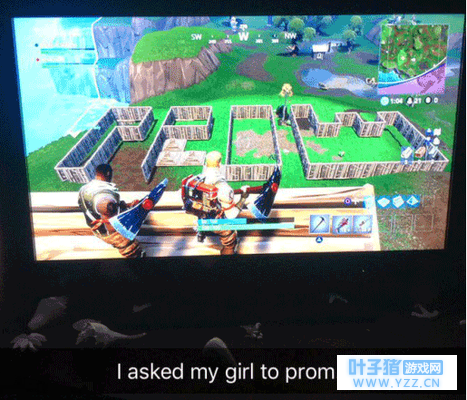 越来越火的堡垒之夜,甚至还成为新的社交潮流。下面这招,就是国外的年轻人们正流行的 堡垒之夜 舞会邀请术。 在下面的图片中,玩家们用射击或者搭建的方式,将 PROM(舞会) 这个单词拼出来,然后展示给他们想要邀请的舞伴。
