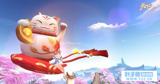 一只萌萌的招财猫坐在福袋之上飞来去飞去,举起的粉粉的爪子向少侠们打招呼。 风生白羽