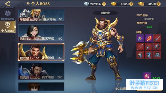 【个人挑战心得】 程咬金需要150级才能开启,当等级达到150级后,装备,翅膀等强化后就可进行挑战,挑战成功后,会有更好的装备来提升战力,当然要注意挑战BOSS的疲劳值和BOSS挑战券,合理运用将会让你领先他人。