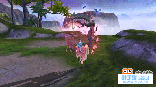 [庭前朱木望飞红。坐“庭木飞红”,看庭前花开花落,云卷云舒] 朱红楼阙,谁凭阑干?老树缱绻地缠着半扇门廊,有花瓣缓缓飘落,配上铺在栏杆上的浅粉锦缎,骑在全新坐骑“庭木飞红”上,似乎让人慢慢触摸到那不可言说的玲珑心意,想必天上的仙子也会在此流连。