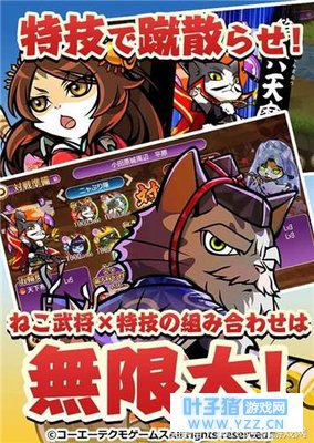 本作特色为将日本战国武将以各种猫的型态呈现,包括大家熟知的织田信长、丰臣秀吉和德川家康等知名武将都将于游戏中化身为猫武将登场,游戏内收录超过200种以上的猫武将,玩家可收集猫武将组织佣兵团「御雇众」锻炼他们出战。