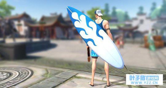 而跟服装配套的背饰则是冲浪板,蓝白的简约配饰,花纹处理上将与之对立的火元素柔化后,就变成了酷炫的水蓝波了。