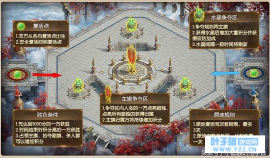 本次雄霸天下跨服赛采用全新地图,以积分定胜负。率先达到1000积分或比赛结束时积分高者获胜。积分的获得有三种方式。一、占领中间主旗可以持续增加积分;二、抢夺刷出的水晶,可以瞬间获得大量积分;三、击杀敌人赢取积分。