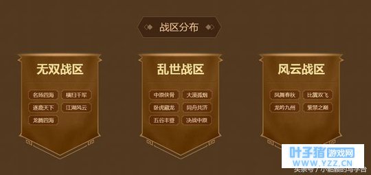 在本次跨服赛中,将全区被划分为三大战区,即无双战区、乱世战区和风云战区。每个战区由数组服务器组成。首先通过晋级赛,每组服务器会晋级六个最强战队代表该服务器,与同战区内其他服务器战队进行跨服对决。共同争夺所在战区的冠、亚、季军。