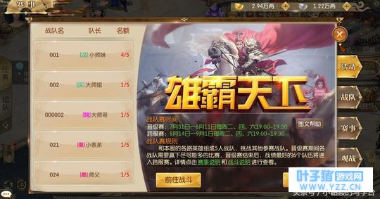 玩家可以点击右上角“雄霸天下”图标参与跨服赛活动,既可以申请加入已有战队也可以邀请家族成员、结拜的兄弟以及好友等一起组成五人战队。这里特别要特别说明的是,为服务器荣誉而战,本服可跨国组队,各路精英抱团无需移民!战队组成后即可报名参加晋级赛了。 7月31日晚7点,晋级赛正式打响,至8月11日,每周二、四、六晚7点到7点半进行战斗比拼。在这段时间,所有报名的战队会与本服其他战队同服竞技。通过胜利场次排名,最终每个服务器都会诞生六个最强战队,参与所在战区内的跨服赛。