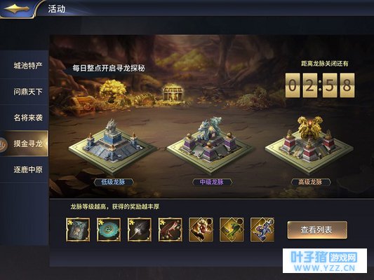四季更替 各享其利 【看点四:计策宝藏,摸金寻龙】 世界地图会整点刷新计策宝藏,包含不同品级的宝箱,主公可以派出精锐队伍夺宝。首次入驻的队伍打败驻守NPC占领宝藏后开始计时。觊觎同一宝藏的其他队伍,可以与已进驻宝藏的队伍一决高下,胜利就取而代之,失败则原路返回。最终结算时根据占领宝藏的时长来排名,前三名会获得丰厚奖励。没有获得奖励的玩家也不用气馁,每天都有5次夺宝机会。