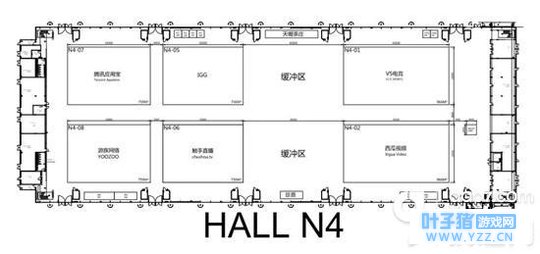相比起前三个展馆,N4展馆的厂商类型相对多样化一些,主要有腾讯应用宝、IGG、V5电竞、西瓜视频、触手直播、游族网络几家。 2018chinajoy N5展馆展台分布示意图