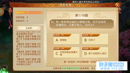 不同于传统游戏中的科举式答题玩法,《百战天下》“谁是真相”真正做到了剑走偏锋,特立独行!在游戏开始后,全服的玩家将要共同答题一共10道,大家可以看看图片中的题目,它没有标准答案只有支持率,一道题共分为两轮进行,第一轮会显示现有选项的支持率,第二轮才是决胜局,选到支持率最低的选项就是真相,这时就看玩家的智慧与临场发挥啦~
