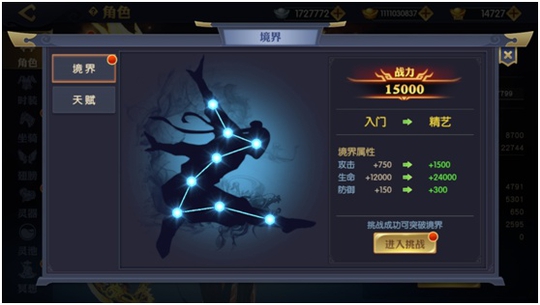 随着战力的提升,另一个新出的玩法就能用到了,境界系统。境界包含2个内容,一个是境界,随着玩家战力的成长,可以解锁飞跃。完全一层全部境界后,会进入到境界挑战中,挑战成功突破到下一个境界。