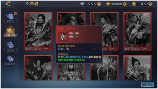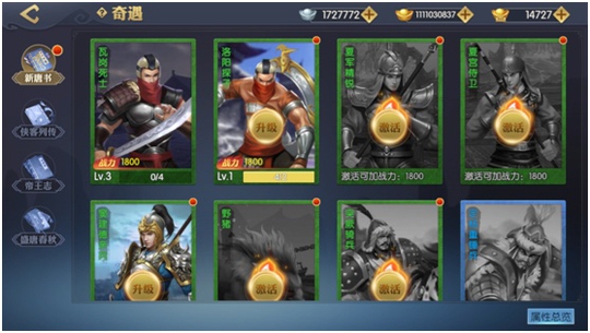 在图鉴里面,可以看到整个奇遇系统分为了新唐书,侠客列传,帝王志,盛唐春秋4个部分。在新唐书里面,记载了所有的普通士兵。而侠客列传,则是剧中出现的将领。
