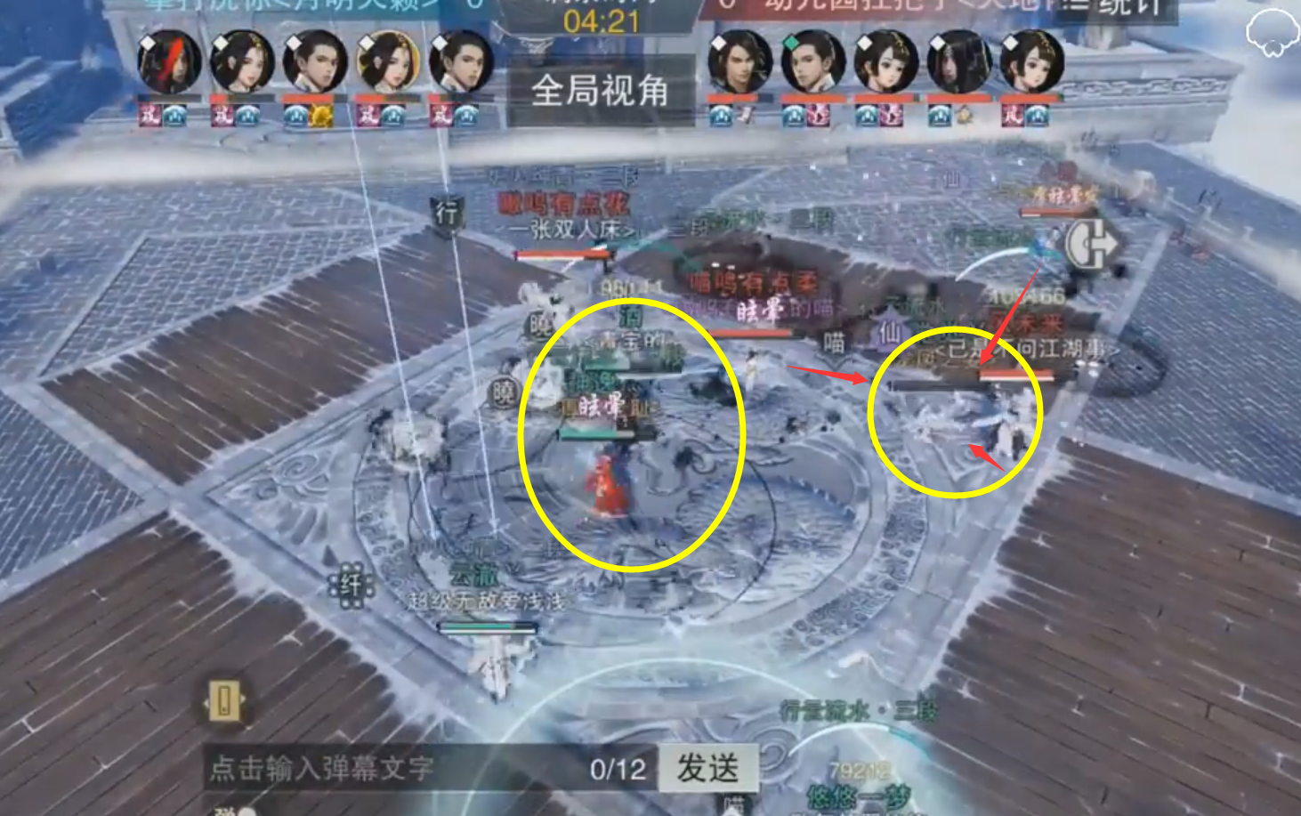 当比赛进行到4分21秒时红方的一个暗香大轻功直接命中蓝方三名人员,睡觉觉这蓝方暗香被轻功AOE加上武当的悟道爆炸和华山的吹风以及两个奶妈的水枪被瞬间秒了,但是红方点花这个暗香轻功完之后没有立马接三分明月,而是在敌方奶妈空气时接了一个蹦床,被奶妈残血逃走,这里如果接的是三分明月奶妈已经必死了。