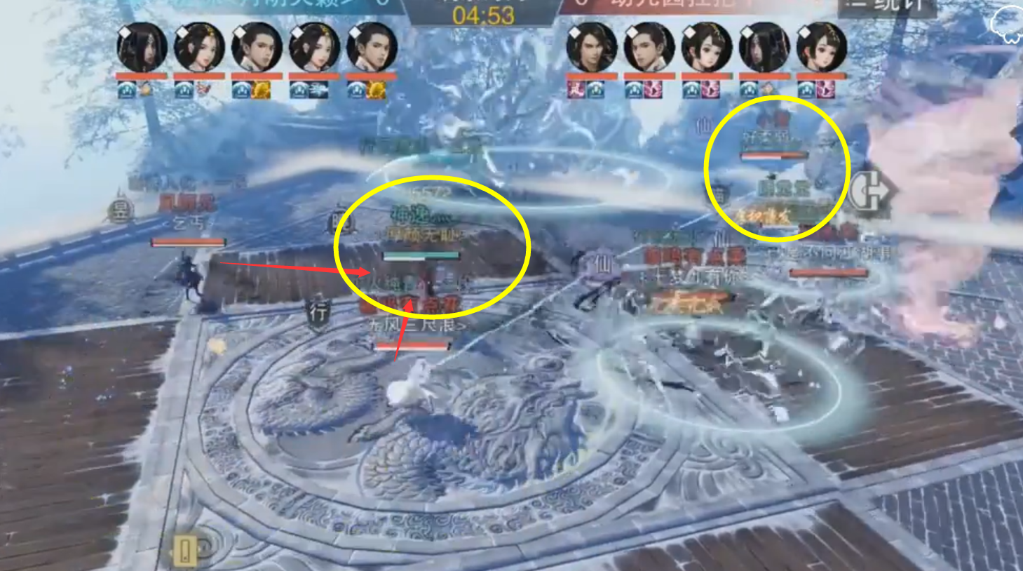 在进行一波开局对抗后,红方武当凤师兄被摸了几下,果断选择大位移跑到场地的另一侧继续进行输出,并且此时蓝方队员站位比较集中,这对于尽有一武当的红方来说,还是比较有利的。