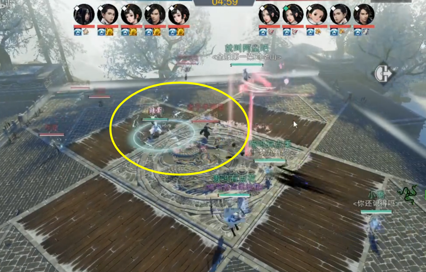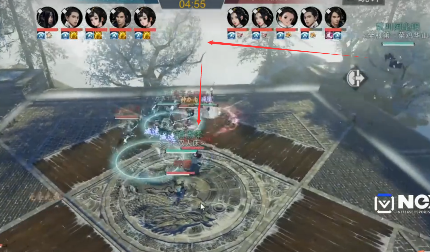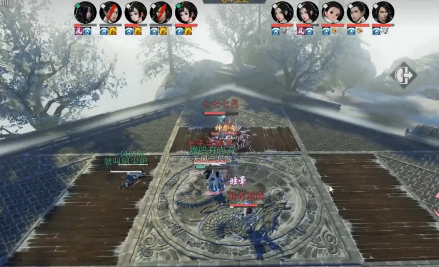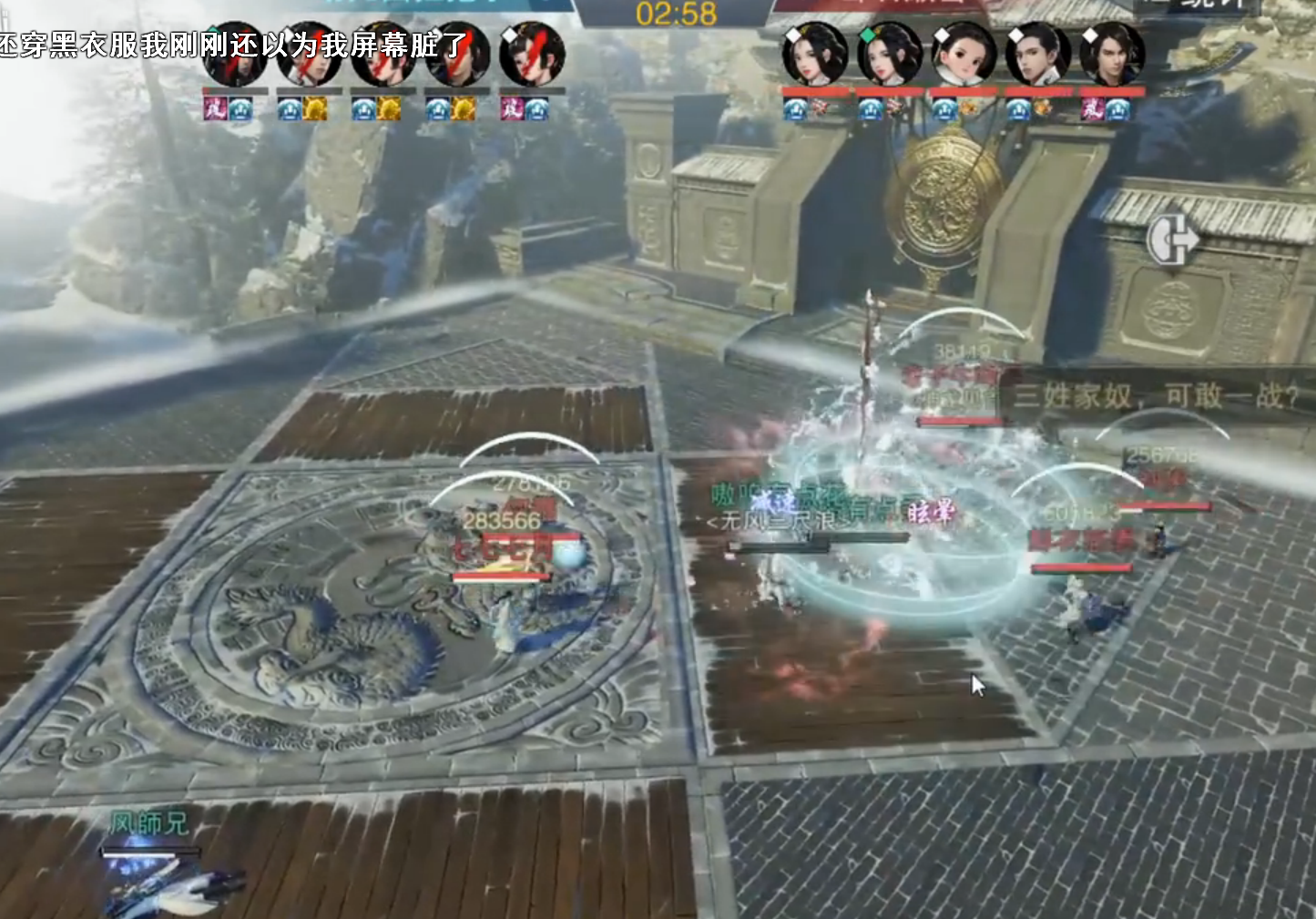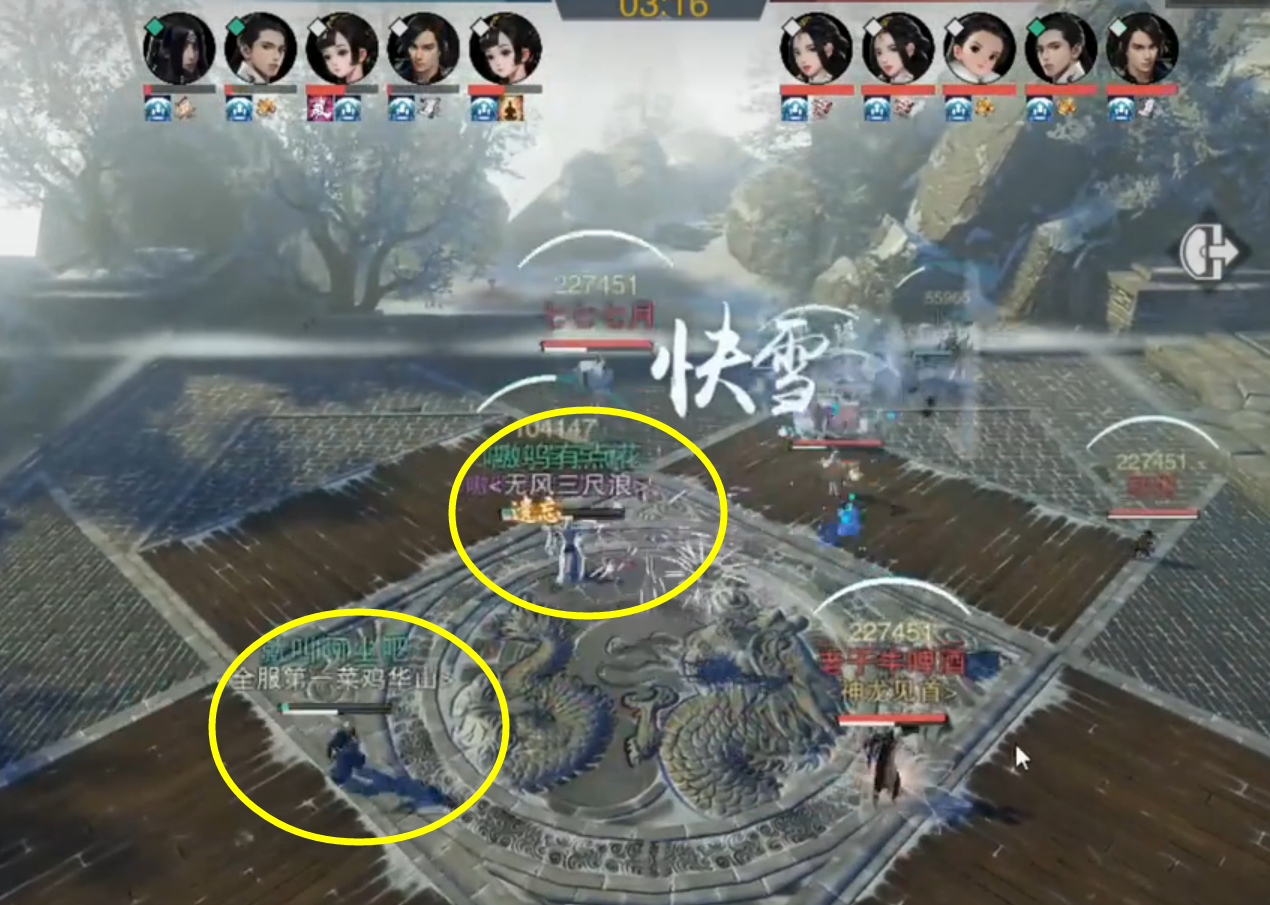 由于开局自创突脸,风师兄很快被打了个反手,残血轻功上天被红方华山怒马一个轻功成功击落。