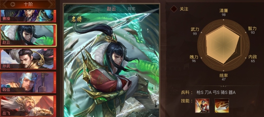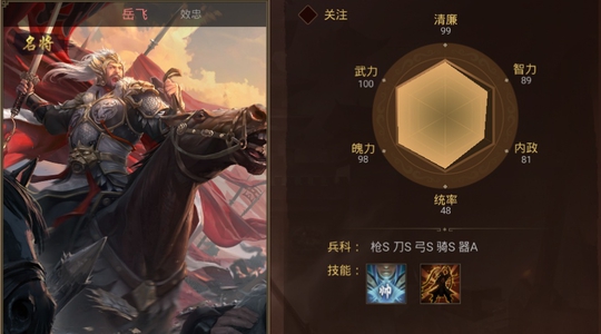 同时,作为一款策略类的手游,除了名将自身属性之外,和兵种的契合度也是决定战争胜利的关键因素之一。比如在游戏中,关羽的对于枪兵,刀兵,和骑兵的统御力都是S级别,但是对于弓兵的相对较弱是A级,所以要是玩家善于使用弓兵,在名将的选择上韩信就优于关羽(韩信弓兵统御力为S)。另一位名将岳飞,作为中国古代历史上的抗金英雄,不管是在刀兵,还是枪兵,骑兵,弓兵上面都是S级别,还拥有一个和关羽一样的技能,而且在清廉和武力上面也稍微领先于关羽,如果玩家是全兵种的发展策略,显然岳飞更加全面,使用也更加灵活。