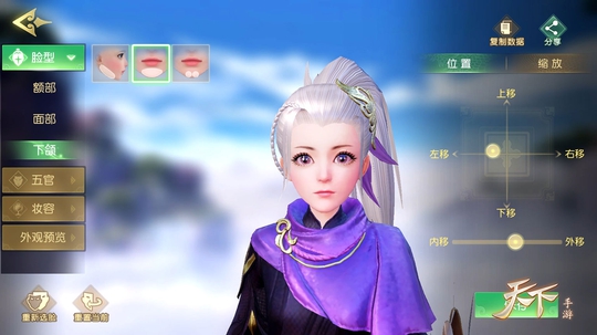 你的颜值,由你自己定义!《天下》手游翎羽捏脸玩法重磅来袭!从五官到妆容,拥有超高精细度的全新捏脸系统今日上线,用细致入微的五官数据和形态各异的绝美妆容,让你拥有与众不同的美!点缀有柔美雀翎的新时装“迦罗泽月”与铃兰花主题坐骑“风铃阵阵”同步上线,唯美大荒等你大驾光临! 【翎羽捏脸系统华丽来袭,颜值高低由你自己定制!】听说有少侠对翎羽脸型不满意?《天下》手游特别推出专属翎羽小师妹的捏脸玩法,每位翎羽玩家都将获得一颗易容丹,从脸型、五官到妆容,每一处细节都可自由设定!无论是面部轮廓、眉眼与鼻唇的上下左右移动,还是大小缩放;无论是眉形、瞳孔、唇妆、眼影,还是各式面部贴花,都可由少侠随心调整!打造可盐可甜的翎羽小师妹,御姐萌妹任你定,既可以cos一回自己喜爱的女明星,也可以将角色脸型捏成自己的模样,每天都拍照欣赏自己盛世美颜!本次捏脸玩法暂时只对翎羽门派开放,看得出,我们的翎羽小师妹真的是备受宠爱呢!