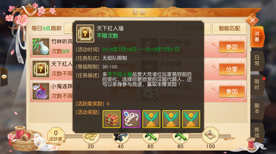 《天下》手游x汉服双弹预热7月再刷大荒颜值新高!全新“幻容花镜”&“天下红人墙” 活动,一键幻化汉服角色,两步搞定上墙展示!集赞、评选、排名等后续缤纷精彩只等你来体验。更有pvp福音之全新战场“劫掠之地”携90级门派战场鞋子与海量战场声望登录大荒!这个七月,来新服“醉梦天香”,四大升级福利为你全程护航! 【秀颜值,赢大奖!《天下》手游x汉服预热活动竞选最美“代颜人”!】穿越回古代的你颜值可以有多高?7月18日- 7月31日,《天下》手游x汉服系列预热活动之“幻容花镜”&“天下红人墙”火热开启!活动期间,少侠可通过游戏内入口参与“幻容花镜”玩法。只需在六套汉服易容模板中挑选心仪的图片,并上传自己的正面照片,就可依据自己的面容幻化成美美哒汉服角色形象啦!选择精选模式的少侠,还可将幻化前后的两份图片上传至候选图库参与后续集赞、评选、排名等玩法,成为最美“代颜人”哦! 全服实时评选出的每个汉服主题前三名的代颜人,还将在木渎镇入口专属广告牌上看到你的动人风姿哦。每个主题排行榜前6的作品更会被直接推送至叶子猪“天下红人墙”活动专题页进行展示。 另外,所有首次参与“幻容花镜”玩法、首次分享幻容图片、首次上墙的玩家都将收获一份君子听风宝箱以资鼓励。总之一句话:大胆秀,就对了!