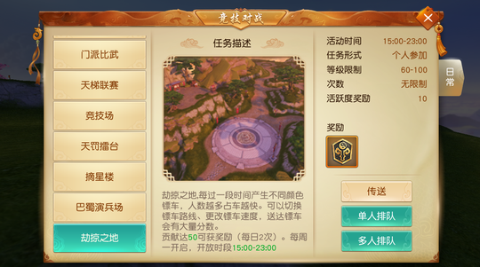 【大荒镖局今日开张!全新“劫掠之地”对抗战场详情曝光!】出现了,是90级门派战场鞋子的光芒!《天下》手游全新竞技战场“劫掠之地”最新情报今日首秀。据可靠消息,本次全新战场将限定60-100等级参与战斗,同时每周一15:00-23:00开放报名。共支持单人&多人两种排位模式,无论是solo还是打团选手都能如鱼得水。战场玩法方面则类似护镖,场地中每过一段时间都将产生不同颜色的镖车,镖车旁同阵营人数越多占车速度越快,完全占有后就可控制镖车的行进路线及设定镖车行走速度,从而更快到达目的地,获得大量积分获胜! 同时,本次更新后将投放90级门派战场最后一个部件——“履”。高额的装备属性与使用特技看得人口水直流。赶紧参与“劫掠之地”新战场赢取海量战场声望、带神装回家吧!