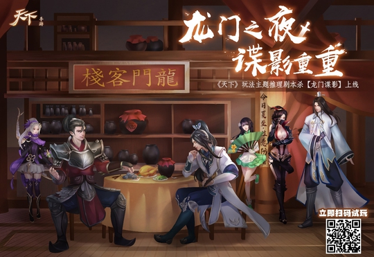 一袭华裳,共赴天下!《天下》手游2019全新版本“国韵风华”来袭,创新ABA非对称竞技玩法“龙门谍影”战场再掀PVP血雨腥风之战!同时,天下手游联动剧本杀公众号“推理大师Club”,为大家带来“龙门谍影”同名剧本杀游戏,现已上线“推理大师Club”公众号与小程序平台;暗杀谜局,少侠敢赴约否?