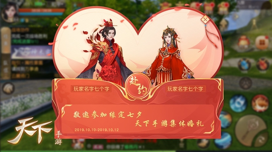 不仅如此,新版本还增添了几个新鲜特别的国风古典趣味玩法,其中,“宫商逸曲”古琴演奏玩法可以说是寓教于乐的典型代表,玩家可以在这项玩法中零基础学习古琴,演奏古今中外名曲,从衣食住行等各个方面感受国风魅力,从而更好地传承中国传统文化。 【欢天喜地闹洞房!国风集体婚礼满屏甜蜜暴击!】本次《天下》手游新版本特别增加“集体婚礼”玩法,亲朋好友一同婚礼燥起来!好闺蜜,当然要一起结婚,开启情侣幻境副本,一同拜堂参与真爱庆典!醉心于婚礼美酒佳肴,疯抢现场红包,还可以纵情享受闹洞房的狂欢惊喜!来一场增进轰轰烈烈的势力集体婚礼,绝对纪念意义十足!