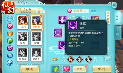 以仙术群攻为主要任务的沈欺霜,她的觉醒技能“逐霓”可提高余霞成绮的伤害并能有效限制敌方的恢复和增益效果;“天师护法”技能还可以大幅度提升奇侠本身的生存能力。届时,配合林月如共同参战,还能在战斗中对沈欺霜的物理防御获得提升。若王小虎和沈欺霜两人同时上阵,缘分值激增,巧妙使用双方的觉醒技能,更有意想不到的效果!