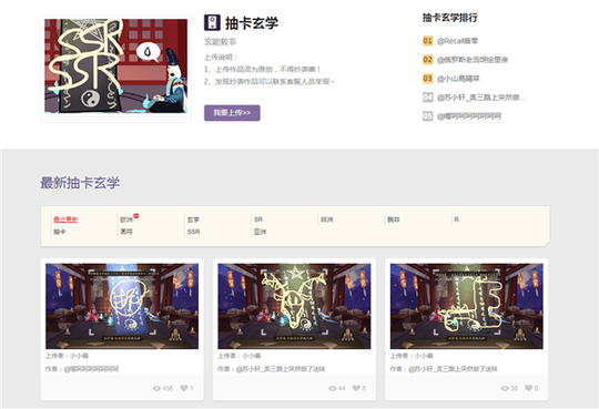 《阴阳师》开通同人专区,就是为玩家量身打造了一个自由创作的同人平台,全方位满足了玩家的表达需求,让他们尽情释放对游戏的热爱。对于非大触玩家,他们也有欣赏和收藏精美同人作品的愿望,而《阴阳师》同人专区汇集了大量出色的原创同人作品,玩家能一次性集中浏览,过足眼瘾。 【栏目多元化!表情包遇上抽卡玄学】 同人专区才刚刚开启,就已吸引了大批粉丝玩家的积极参与,优质的同人漫画,形神兼备的Cosplay、精美的游戏截图、恶搞逗趣的表情包、抽卡玄学攻略......玩家的才华再次体现得淋漓尽致,让人大开眼界。同人绘栏目中大量以游戏主角和式神为原型的作品,其精细唯美程度不输原画,一些走可爱和夸张路线的画作同样让人爱不释手;同人COS版块中各位Coser对游戏人物的高能还原也十分夺人眼球,阅览量居高不下;而众多玩家在游戏中最爱的一大玩法应该就是画符抽卡了,朋友圈晒手气晒SSR已然成为一种风气,因此也在同人专区专门开设了抽卡玄学专栏,供玩家上传自己抽卡时画的符咒,交流抽卡玄学心得。