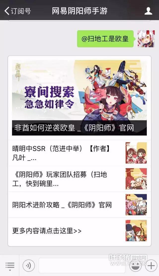 ☆寮间搜索玩法教学☆ ★第一步★ 你需要一个正常的手机 ★第二步★ 关注网易阴阳师手游公众号 打开公众号聊天界面 输入@你想了解的内容