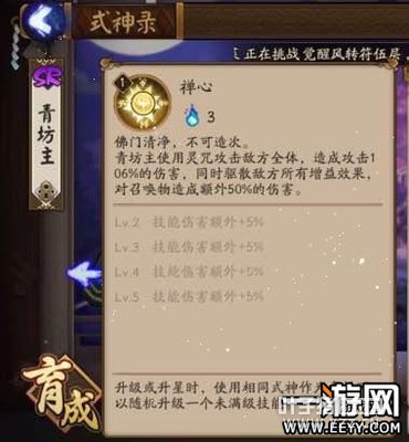 被动技能:不废火,且不能被驱散(青坊主登场时立刻触发,头上没有BUFF,即青坊主存活于场上时,被动技能一直有效,但可被封印)能在战斗中增加效果命中,可配合效果命中收益的式神一起使用,且效果抵抗可以与一目连和镰鼬的BUFF叠加,不冲突 禅心技能: 实测可以驱散:酒吞狂气、二口女的子弹印记、骨女的怨气标记以及所有式神加的BUFF 实测不可驱散:一目连的盾+BUFF,所有阴阳师的BUFF(不能穿过晴明的盾)