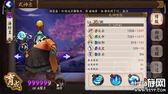 御魂是从茨木身上弄下来的,攻击能堆高点就堆高点,反正弄不死自己就行,最好是攻击两件套。攻击越高打得越快,特别是7层的草。 重点来了,鱼头的大招什么时候放?我个人经验是,放完大招之后,剩下的火够N-1个到回火回合数的兔子跳舞的。举个例子,鱼头大招的时候是8火,大完之后是5火,还需要三个我方式神行动才回火。剩下的5火理论上只够 两个兔子跳舞的,但是尾速兔子带招财,也就是只要两个兔子有一个触发了招财就行。连续不触发招财的几率是很小的,就算不触发也有晴明的盾和缚,威胁不大。还有就是鱼头行动完就回火,当前剩余5火或以上的情况也可 以放。但是在对面有地藏的时候建议不要放大招,保险起见先用晴明干掉带地藏的再安心放大。 最后祝大家都早日刷出皮肤。这皮肤真的挺好看的