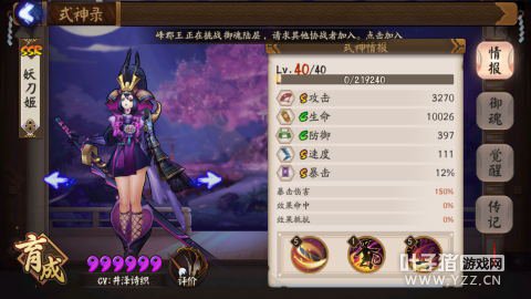 妖刀姬的觉醒需要8个中级风和16个高级风以及8个中级雷和16个高级雷。可以看到她各个属性方面的提升为: 攻击S→S 生命C→C 防御C→C 速度B→S 暴击S→S 并且解锁了妖刀姬的二技能连斩,这个技能的解锁又一程度的提升了妖刀姬的输出能力。 妖刀姬的技能: 【不祥之刃】妖刀姬对敌方单体目标造成攻击100%(满级120%)的伤害。 妖刀姬的普攻技能,很普通,满级仅120%甚至还不如一些式神的满级125%的普攻。 【连斩】被动技能,妖刀姬在造成伤害时有20%的几率造成自身攻击40%的额外伤害。 此技能是辅助提升妖刀姬输出的,并不清楚妖刀姬面板上的效果命中是否能为此技能带来收益,不过即便能带来收益,由于基础概率太低,叠效果命中也不是个理智的选择,所以还是优先考虑攻击。此外,经测试该触发效果享受暴击之后的暴击伤害加成效果,即此技能伤害能暴击。 【杀戮】消耗3点鬼火,妖刀姬锁定敌方一个目标进行多段攻击,每次造成攻击50%(满级58%)的伤害,如果目标死亡,则对敌方当前生命最低的单位进行攻击,妖刀姬最多攻击6次。 这个技能是妖刀姬输出的核心技能,妖刀姬最多进行6段攻击,例如妖刀姬耗费4次攻击次数消灭敌方一个单位后,只会对当前敌方生命值最低的单位再进行2次攻击。多段攻击有利有弊,如果是暴击妖刀姬,在遇上地藏时此技能伤害会稍显疲软。 御魂选择: 妖刀姬最强的御魂搭配不外乎针女,针女对多段系输出的伤害提升很高。除此之外,网切也是个不错的选择,修改过后的伤魂鸟同样也较为适合妖刀姬,但最为适合妖刀姬的还是针女。 推荐二四号位御魂主属性攻击加成,六号位暴击,此时的御魂搭配即为针女/网切/伤魂鸟+2暴击/攻击散件,原则上如果满暴了,散件选择攻击加成会让妖刀姬的输出更高。如果选择伤魂鸟六号位主属性可以换成攻击加成,这样的妖刀姬会不那么害怕地藏,但是输出也会偏低。 有条件的玩家可以选择培养一个爆伤妖刀姬,这会让妖刀姬的伤害更为不俗,此时六号位需要携带暴击伤害主属性的御魂,御魂搭配为针女/网切/伤魂鸟+2暴击散件。 阵容选择: 妖刀姬适用于先手阵容中做主力输出,常规的双拉双输出一波流就比较适合妖刀姬,推荐另外一个输出式神搭配茨木童子,让茨木童子的速度快于妖刀姬,让妖刀姬打出收割的效果。因为如果另外一个输出也是针女系式神,对面阵容中要是携带了多个地藏,就会出现完全打不动对面的尴尬情况。 妖刀姬并不适合用于后手阵容中,后手阵容的输出位置选择还是常规的吸血姬或者酒吞童子会比妖刀姬略胜一筹