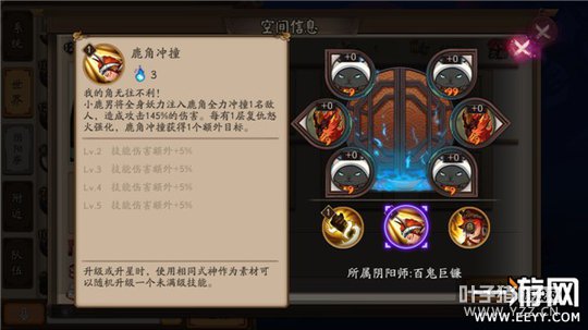 更新后技能: 复仇怒火: 战场上每阵亡一个式神,小鹿男会获得一次强化,吸取目标40%的攻击,最多强化3次,总加成不超过小鹿男攻击的200%。