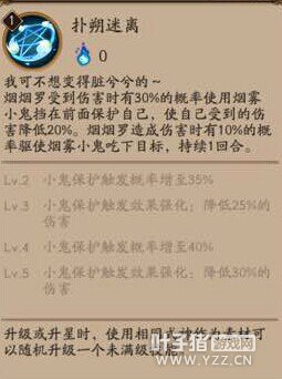 第二:烟烟罗最重要的反而是二技能,被动技能特备是升满级之后,45%的几率可以减低30%的伤害,而且每次造成伤害的时候有10%的几率可以吃掉对手一回合,今天看了UP主冰冷之海的视频,发现吃掉是一种晕眩状态,目前不知道可不可解,以前是否可以同时控制多个目标,不过作为一个被动可减伤,可控制已经十分不俗。