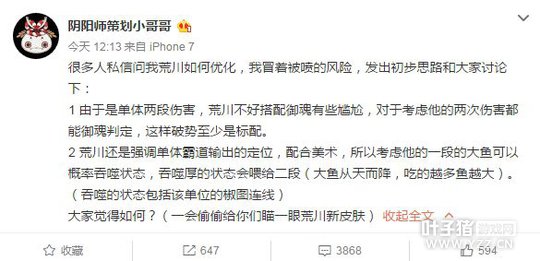 文字版: 很多人私信问我荒川如何优化,我冒着被喷的风险,发出初步思路和大家讨论下: 1、由于是单体两段伤害,荒川不好搭配御魂有些尴尬,对于考虑他的两次伤害都能御魂判定,这样破势至少是标配。 2 、荒川还是强调单体霸道输出的定位,配合美术,所以考虑他的一段的大鱼可以概率吞噬状态,吞噬厚的状态会喂给二段(大鱼从天而降,吃的越多鱼越大)。(吞噬的状态包括该单位的椒图连线) 大家觉得如何?(一会偷偷给你们瞄一眼荒川新皮肤) 下面是策划哥哥偷偷爆料的荒川之主新皮肤: