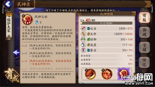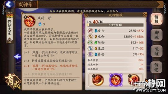 ②单体护盾:加成比三技能略高,被破盾后有个群体伤害,群体伤害特点:1.可以透过清明罩子 2.可以暴击并且享受爆伤以及御魂效果,比如我把盾给茨木(100暴击180爆伤破势套)那么这个盾会百分百暴击并且伤害多80%如果敌方生命大于%70还能再多破势40%。这个伤害还是很客观的,在我肉队被罚站,偶尔能动一下的情况下我可以利用这个技能搞死对面残血火机。