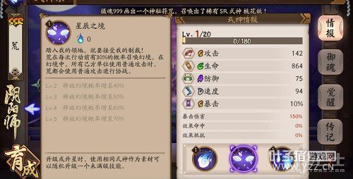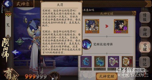 “荒”的觉醒技能“天罚”是非常有特点的一个技能,它是根据鬼火多少来判定攻击次数,每次使用1点,直至鬼火耗尽。初始是对目标生命最高的敌方单位每次造成88%伤害,满级后可额外增加10%,流星暴击时降低目标12%防御力,所有流星陨落后,还能给敌方全体造成一次攻击12%暴击次数的伤害。这种能在一定程度上造成压制的式神,是非常值得培养的输出。