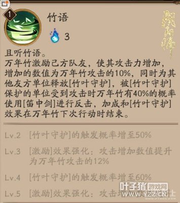 “竹语”能辅助队友更为有效地输出与生存,因此万年竹算是集增益、反伤于一体的稳固型式神。