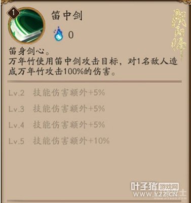 在战斗能力上,万年竹输出能力和生存能力都决定了他是一个极为协调的角色,能够在辅助中暗藏凌厉的攻势。普攻技能“笛中剑”初始伤害100%,满级后可以额外增加25%。
