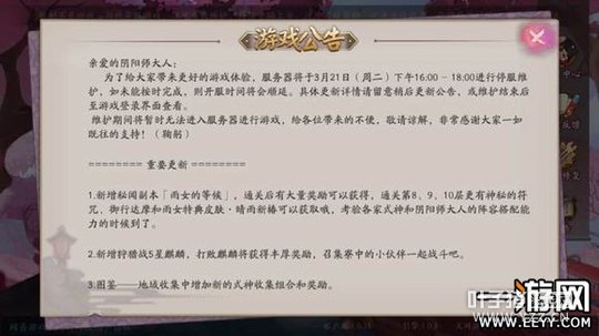 没猜错 就是雨女副本 然后地域更新了一下 小鹿男那个给座敷童子的皮肤 茨木花鸟卷那个给四星达摩 妖刀鸡一目连给黑蛋 荒给御札 秘闻副本-雨女的等候 奖励一览: 第一层:招福达摩x1 第二层:金币x20000 第三层:勾玉x100 第四层:奉为达摩x1 第五层:金币x100000 第六层:勾玉x200 第七层:大吉达摩x1 第八层:神秘的符咒x1 第九层:御行达摩x1 第十层:雨女皮肤-晴雨新椿x1 难度:还没打,等吃完饭再打打试试,后续更新…… 图鉴地域收集新增组合奖励 1,九州-星之妖:小鹿男+辉夜姬+樱花妖+万年竹 ,奖励:座敷童子皮肤-福来运至 2,山阳山阴-星之妖:黑童子+白童子+一目连+惠比寿 ,奖励:御行达摩x1 3,中部-星之妖:烟烟罗+金鱼姬+络新妇+妖刀姬 ,奖励:御行达摩x1 4,北海道-星之妖:夜叉+青坊主+荒+清姬 ,奖励:御札x300 5,四国-星之妖:姑获鸟+花鸟卷+般若,奖励:4星奉为达摩x1 6,近畿-星之妖:古笼火+首无+傀儡师+茨木童子,奖励:4星奉为达摩x1 新增狩猎战5星麒麟 目前还没开,7点钟看下5星麒麟的血量和强度,后续更新……