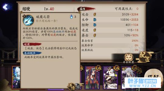 1、爆伤 因为302%的大招加成和大招攻击破魔效果的双倍伤害,桔梗被定义为了一个输出式神,而且是单端单体输出,所以爆伤破势成为了很多玩家的首选。不过,我们分析来看,桔梗其实第二箭的伤害会翻倍,所以伤害应该是第二次攻击,第二次攻击破势线很容被打破,所以爆伤网切或者心眼也许会更好。