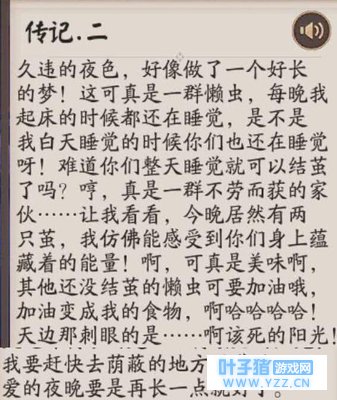 首先在传记一里,於菊虫她在白天还是那些尚在茧里的虫子的温柔老师,鼓励他们勤奋地积攒能量。从传记一能看出来於菊虫作为一名老师是相当温柔负责了。一切看起来都很美好。