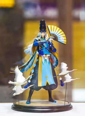 从现场展示的手办可以看到,玉藻前脸上的狐面、手上的折扇、胸前的日本太鼓、衣服上的诸多流苏和串珠都悉数得到了还原,而半透明的蝶形披肩更是呈现出若隐若现的质感。寮办还为大家准备了一份惊喜---玉藻前的面具是可拆卸的。这次大家终于可以一睹这位一向以面具或浓妆示人的绝代之妖的真容! 【云鹤乘风,晴明手办出展】这款手办的原型是晴明最经典的拈诀形象:浅蓝色的狩衣以浅金衬边,承托出传奇阴阳师晴明的气宇轩昂;一头白长发如瀑布般披肩垂下;右手将鎏金折扇展开挡在侧脸前,左手拈出阴阳之诀,咒术落下,百鬼驱尽!而最有特色的便是地台上几只展翅欲飞的仙鹤,他们围绕在晴明四周,似有流动的气息一般,画面栩栩如生。