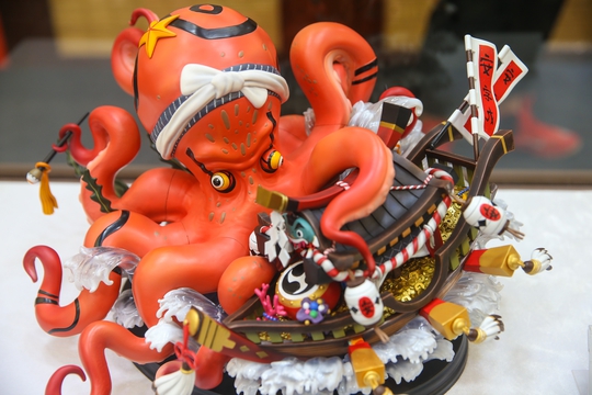 此前,胧车和呱们已经多次在现世亮相,如《阴阳师》各大展览活动上的一比一巨型胧车,几只SSR呱太手办。而本次展会上,则是小型化雕像胧车的首次曝光。这款胧车细节十分丰富:车头的鬼面张牙舞嘴,脸上的渐变阴影相当细腻;拉车的呱们形态各异,活灵活现;连车身上木栏杆的铆钉也得到了还原,可谓匠心十足。 另外一只大人们天天围殴的经典BOSS石距也同时来袭,橙红色的“大章鱼”卷浪而来,攀扶在宝船上,不让旁人靠近。