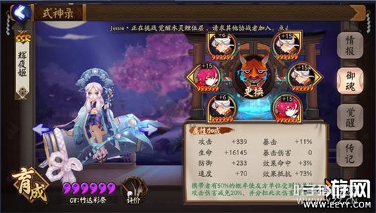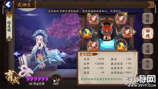 1技能【蓬莱玉枝】:有10%的概率打掉对面一点鬼火。 2技能【火鼠裘】:满技能情况下,辉夜姬受到攻击有40%概率回复一点鬼火,在幻境中,队友受到攻击同样有40%概率回复一点鬼火。 3技能【龙首之玉】:释放幻镜,满技能情况下,增加全队25%防御和20%抵抗。 辉夜姬最亮眼的技能是觉醒后开场即释放幻境,在提高队友生存能力的同时,全队任何人挨打都有概率回火。 作为高配打火机,回火显然是辉夜姬的核心技能,而辉夜姬回火的途径有两个—— 一是己方式神每次行动前有一次判定,67%的概率加一点鬼火; 二是自己受到攻击有40%概率回火,幻境中队友受到攻击也有40%回火; 从这两点来看,辉夜姬在PVE中的使用性能会打个折扣。就拿刷魂10来举例,常规山兔+3针女输出+打火机的阵容,目的就是为了一波速刷,而如果用辉夜姬代替打火机,67%回火的概率存在断火的可能性,一旦断火,就算不翻车,也会在一定程度上拖慢整个队伍的节奏。 (以及,我的队友表示:辉夜姬的技能释放太慢了,而且闪瞎眼) 辉夜姬在PVE中的稳定性不如打火机,不过辉夜姬也并不是不能用,我和队友在魂10实测过,火灵辉夜姬+招财山兔,开场6火+招财+6次回复鬼火的判定,求稳的话,最好3dps的速度都低于阴阳师和辉夜姬。 御魂搭配: PVE用火灵,可以适当堆一点速度,不推荐带招财。辉夜姬本身技能就是概率回火,招财同样也是回合开始前50%概率回火,相比火灵不够稳。 重点来说一下PVP的御魂—— 辉夜姬在PVP的御魂搭配可选择性有很多。 1,木魅/返魂香
