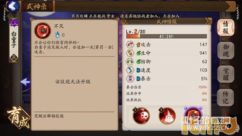招魂 白童子对全体敌方单位造成攻击106%的伤害,并唤醒所有阵亡单位的魂魄,魂魄只能行动一次,继承目标100%的攻击,并在被唤醒时立即使用普攻对随机目标进行攻击。 一个很强大的技能,这个技能虽然伤害比较低,但是后续的召唤效果非常不错。首先是攻击力继承为100%,对比跳跳妹妹的召唤技能要高上不少;再者就是魂魄召唤出来以后可以立即攻击,这意味着到了战斗后期,释放一次这个技能,我们可以平白比敌人多攻击很多次。而且,根据小编的实验,当白童子召唤的魂魄击杀目标后,白童子同样可以再次触发不灭效果。 从属性上来看,白童子的攻击和速度都是为S级别,这意味他是一个输出型的式神,不过由它的技能来看白童子实际上只适合作为一个辅助输出存在于场上。首先,白童子的技能伤害只有106%,真正起作用的是他召唤的魂魄,所以把他作为主力输出的收益不大;其次白童子的技能让白童子在残局情况下非常强势,但白童子的生命和防御并不算顶尖,所以如果把他作为一个主力输出培养,那么他能不能生存到残局都是一个问题。因此在这种矛盾的情况下,白童子更适合作为一个堆血量和防御的辅助输出存在。 白童子御魂搭配:小编在上文中谈到了白童子技能属性的矛盾之处,然后得出了白童子更加适合作为辅助输出的存在,所以在这里小编推荐的白童子的御魂夜也是以辅助输出为主。